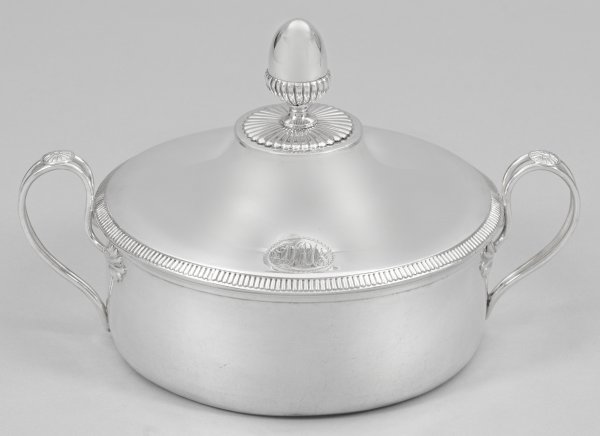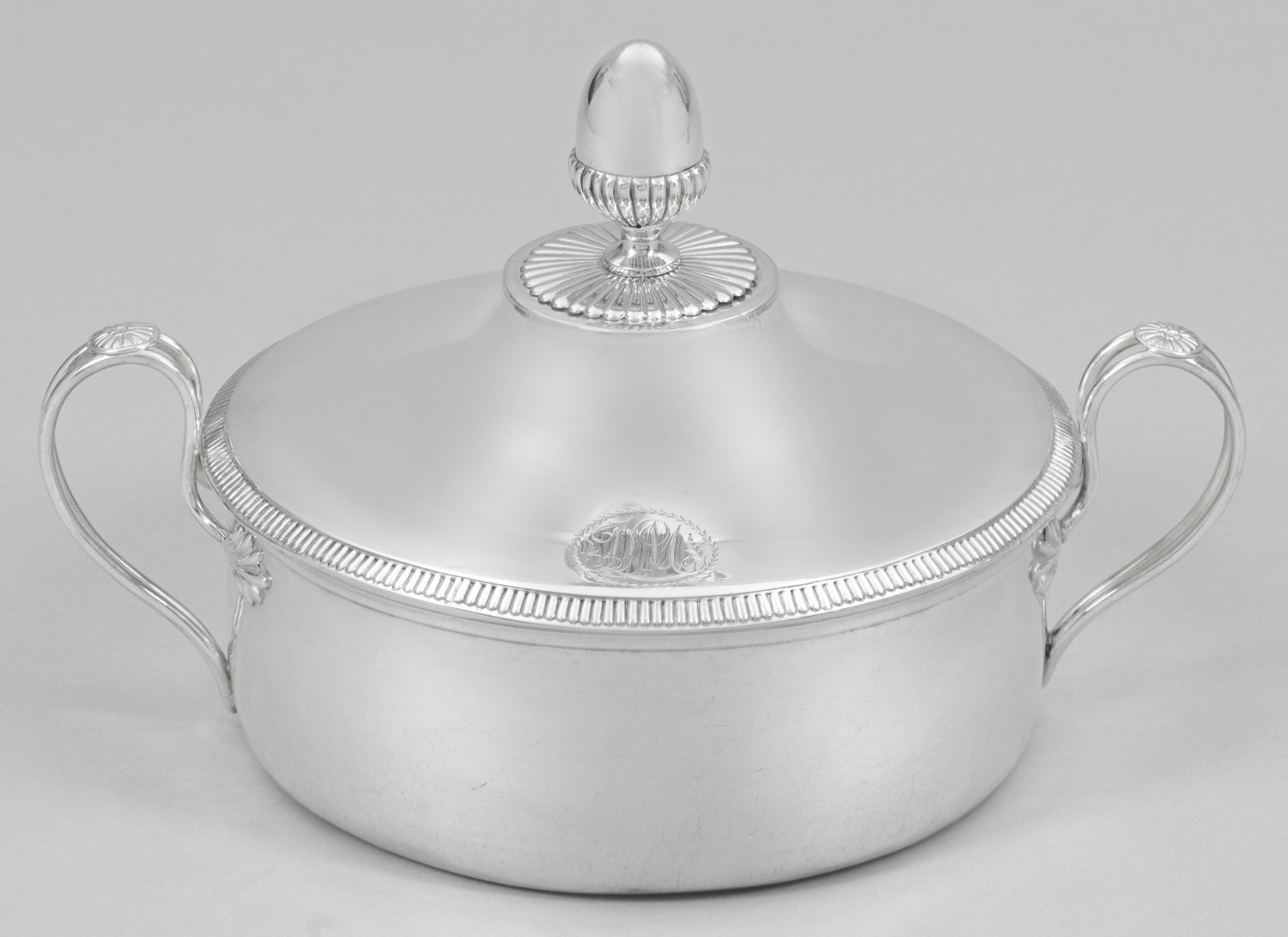 Qualitätvolle Gemüse-Deckelschale Silber. Runder, flacher Korpus mit glatter Wandung. Seitliche Griffe, aus je zwei filigranen Strängen geformt, in stilisierten Blättern endend. Obenauf verziert mit floral gestalteter Rosette. Zur Mitte hin aufgewölbter Deckel mit vollplastischem Knauf in Form einer Eichel, umgeben von Godronen. Auf dem Deckel von Blätterkranz gerahmtes Monogramm "JLM". Der Rand umlaufend mit reliefplastischem Zungenfries verziert. Gest., Stadt- und Beschauzeichen, Meister wohl Isaac Amaron (tätig seit 1815). Gew. ca. 837 g. H. 16 cm.