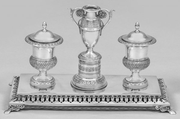 Empire-Schreibzeug Silber. Vier ausgestellte Füße am Ansatz mit stilisierten Blüten besetzt übergehend in rechteckige Plinthe mit durchbrochen gearbeitetem Rand in Form von Blättern und Blütenknospen. Darüber drei montierte bauchige vasen- bzw. amphorenförmige Gefäße. Zentraler Federhalter flankiert von Tintenfass mit Glaseinsatz und Sandstreuer je mit korrespondierend aufgewölbten Deckeln. Umlaufend verzierende und reliefierte Blatt- bzw. Ornamentbänder. Gest. Beschaumarken Meistermarke. Gew. ca. 284 g. H. 12 5 cm. 21 2 cm x 9 cm.