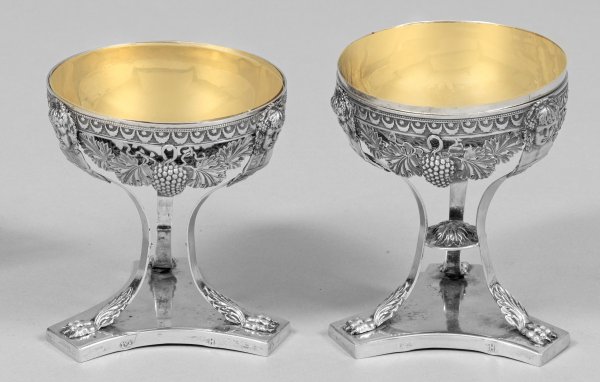 Paar Empire-Salieren Silber. Über flachem, dreipassigem Stand mit Klauenfüßen und Blattansatz drei geschweifte Beine, übergehend in filigran durchbrochen gearbeiteten Rand. Umlaufend reliefplastischer Bandfries mit Maskaronen und Festons aus Weinblättern und -reben. Glatter, halbrunder Schaleneinsatz. Innen vergoldet. Teilw. besch. Gest. 12 Lot und "H". Gew. zus. ca. 184 g. H. 9,7 cm.