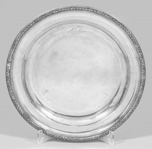 Anbietplatte Silber. Gemuldeter, glatter Spiegel, übergehend in breite, leicht ansteigende Fahne. Der Rand umzogen von einem reliefierten Lorbeerblattfries. Altersbedingte Gebrauchsspuren. Gest. 13 Lot, Stadtmarke, Jahresbuchstabe "G". Meister Hofjuwelier Georg Julius Friedrich Knauer (wird Meister um 1816). Gew. ca. 695 g. D. 30 cm.