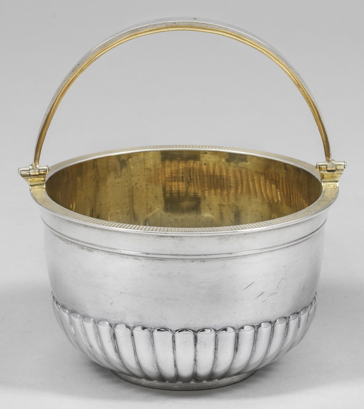 Qualitätvoller Henkeltopf für Eiswürfel Silber teilvergoldet. Über kurzem rundem Standring eine Schale mit zylindrisch aufsteigender glatter Wandung und abgesetztem breitem Lippenrand. Übergreifender beweglicher Henkel. Untere Wandungshälfte von Godronen umzogen. Der Lippenrand mit feinem symmetrischem Liniendekor verziert. Gest. 84 Tremolierstriche Stadtmarke Beschaumeister Alexander Ilitsch Jaschinow. Gew. ca. 460 g. H. 16 cm. D. 13 7 cm.