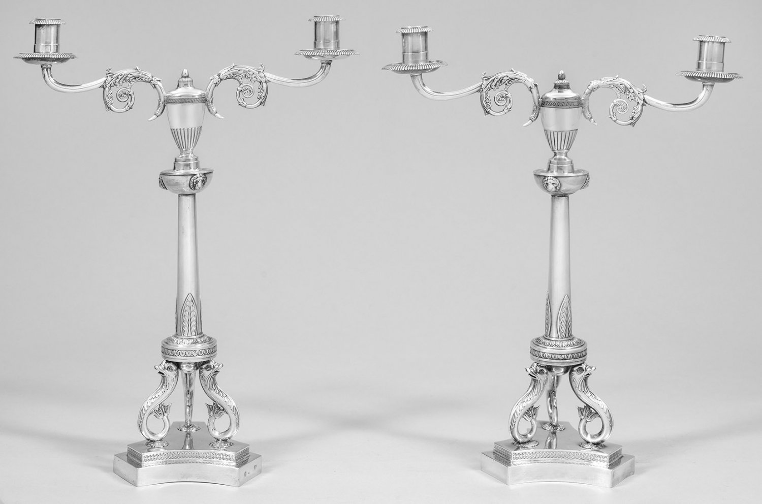 Paar seltene Empire-Girandolen 2-flg.; Dreiseitig geschweifter, getreppt ansteigender Stand. Von drei Delphinen getragener, blattreliefierter, konischer Schaft mit halbrundem Kapitell. Oberhalb hohe, abgeflachte Vase. Davon ausgehend zwei geschweifte Leuchterarme mit zylindrischen Tüllen. Minim. rep.; Gest. 12 Lot, Stadtmarke, Meister Friedrich August Kind (Lehre 1770-1775). Gew. zus. ca. 1265 g. H. 37,5 cm.