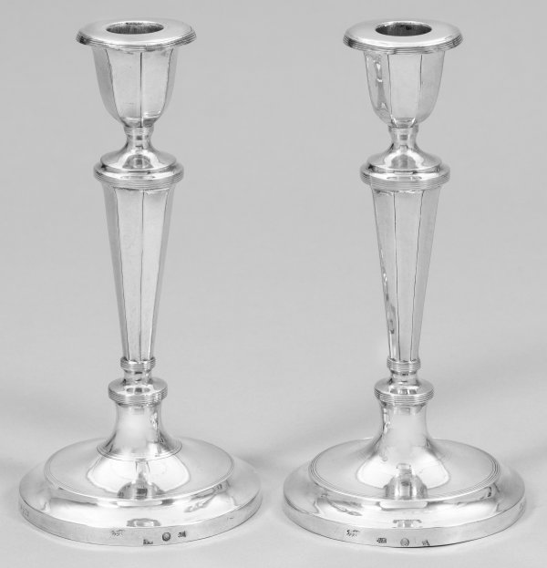 Paar Tafelleuchter Silber. Runder aufgewölbter Stand übergehend in achtfach gekanteten konischen Schaft mit vasenförmiger facettierter Tülle. Glatter Korpus mehrfach mit feinen Profillinen verziert. Herausnehmbare Traufschale. Stand mit später gravierter kyrillischer Besitzergravur. Gest. 84 Tremolierstrich Stadtmarke Beschaumeister Alexander Ilitsch Jaschinow undeutliche Meistermarke. Gew. zus. ca. 875 g. H. 18 cm.