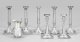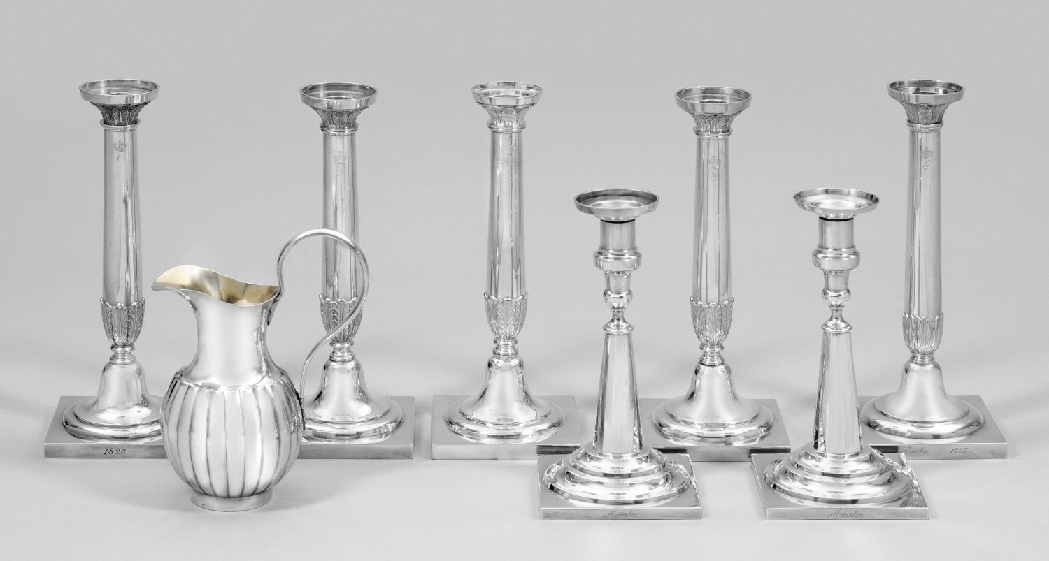 A rare Dessau silver ensemble consisting of seven table candlesticks and a jug with handle from the princely private property of the family of Anhalt-Dessau. Partly gilt inside. Standard marks 12 and 13 lot, city and by until now unidentified master´s mark, partly test mark.
