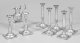 Silber. 8-tlg.: Ein Paar kleine und fünf große Tafelleuchter sowie eine Henkelkanne. Die Leuchter mit trompetenförmigem, getrepptem Stand über quadratischer Plinthe. Hoher, gering konischer und glatter Schaft, teilw. facettiert bzw. an Basis und Kapitell mit reliefiertem Akanthusblattdekor. Ausschwingende, gemuldete Traufschale. Die Henkelkanne mit gebauchtem Korpus und schlankem Hals, übergehend in einen gezogenen Ausguss. Die untere Wandungshälfte verziert mit breiten Godronen. Hochaufschwingender Bandhenkel jeweils in einem stilisierten und reliefierten Blatt endend und innen vergoldet.