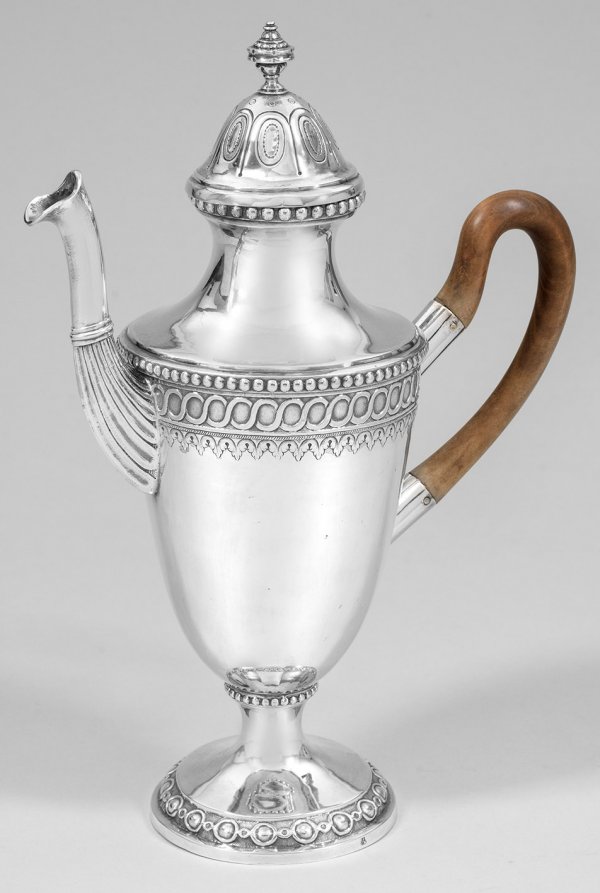 Große Augsburger Louis XVI-Schenkkanne Silber. Von einem Ringfries gerahmter Rundfuß. Sich konisch erweiternder Korpus mit glatter Wandung unterhalb der abgesetzten Schulter umzogen von unterschiedlichen Relieffriesen. Mittig angesetzte kannelierte Tülle glockenförmiger Deckel mit Vasenknauf. Ohrenhenkel aus Holz. Gest. Stadtmarke Meister Johann Christian Neuss (wird Meister 1766). Gew. ca. 950 g. H. 34 cm.
