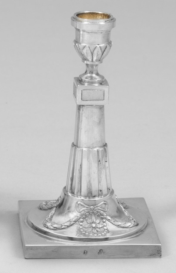 Kleiner Louis XVI-Tafelleuchter Silber. Über quadratischer Plinthe konischer Rundfuß mit reliefplastischen von Lorbeerfestons getragenen Rosetten. Konischer kannelierter Schaft mit vasenförmiger Tülle. Gest. Tremolierstrich Stadtmarke Meister Johann Christian Neuss (wird Meister 1766). Gew. ca. 170 g. H. 14 cm.
