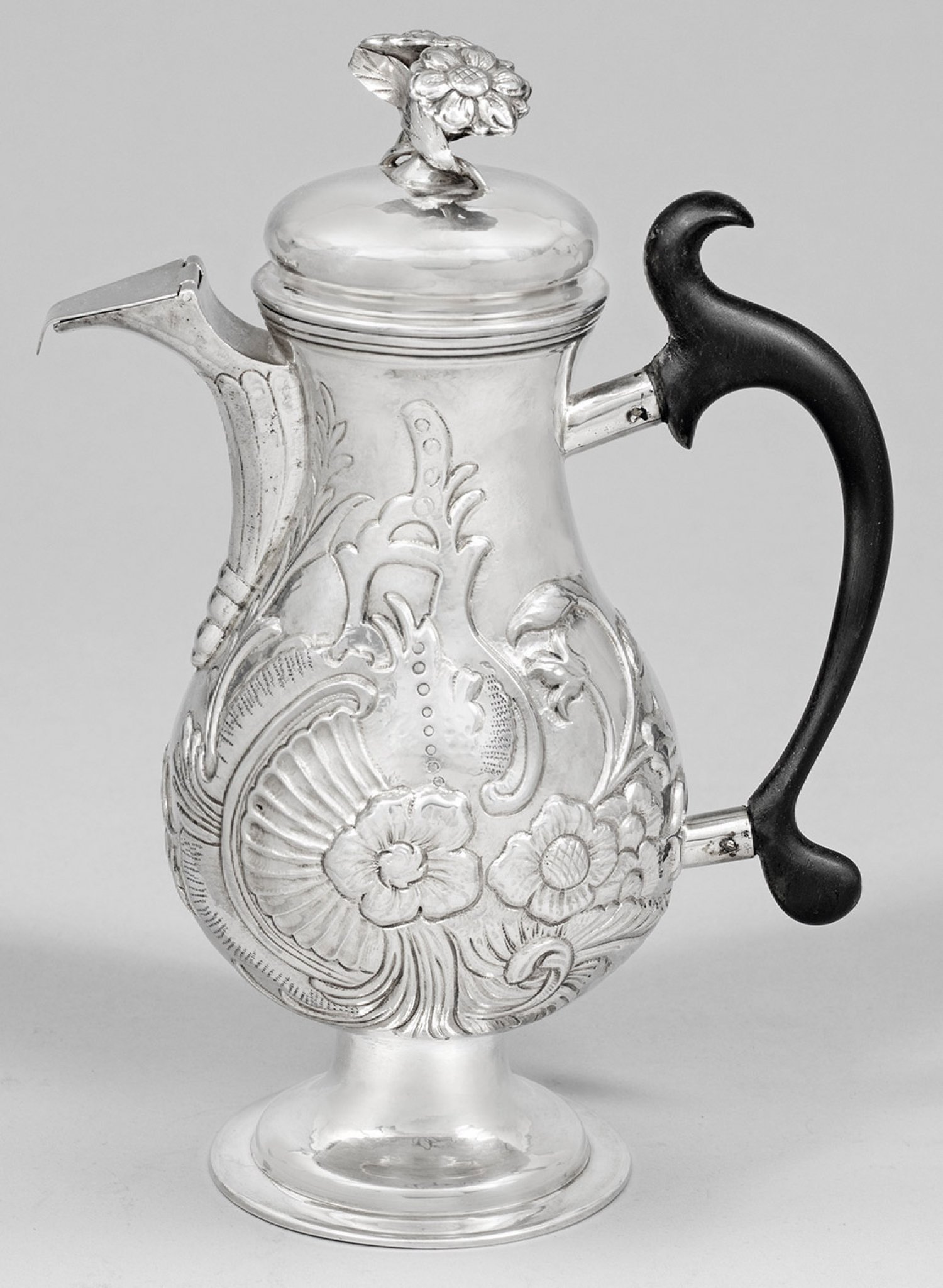 Rokoko-Kaffeekanne Silber. Über flachem Stand birnförmiger Korpus. Tief angesetzter Schnabelausguss mit scharnierter Abdeckung. Wandung flächendeckend hochreliefplastisch getrieben und graviert in Form von Rocaillen, Blumen und Blattwerk. Gewölbter Deckel, bekrönt von Blütenknauf. Korpus durch zylindrische Stege verbunden mit schlankem Volutenhenkel aus ebonisiertem Holz, rest.; Innen vergoldet. Gest., Stadtmarke, undeutl. Meistermarke, wohl Meister Wilhelmus Sittmann (wird Meister 1753). Gew. ca. 650 g. H. 26 cm.