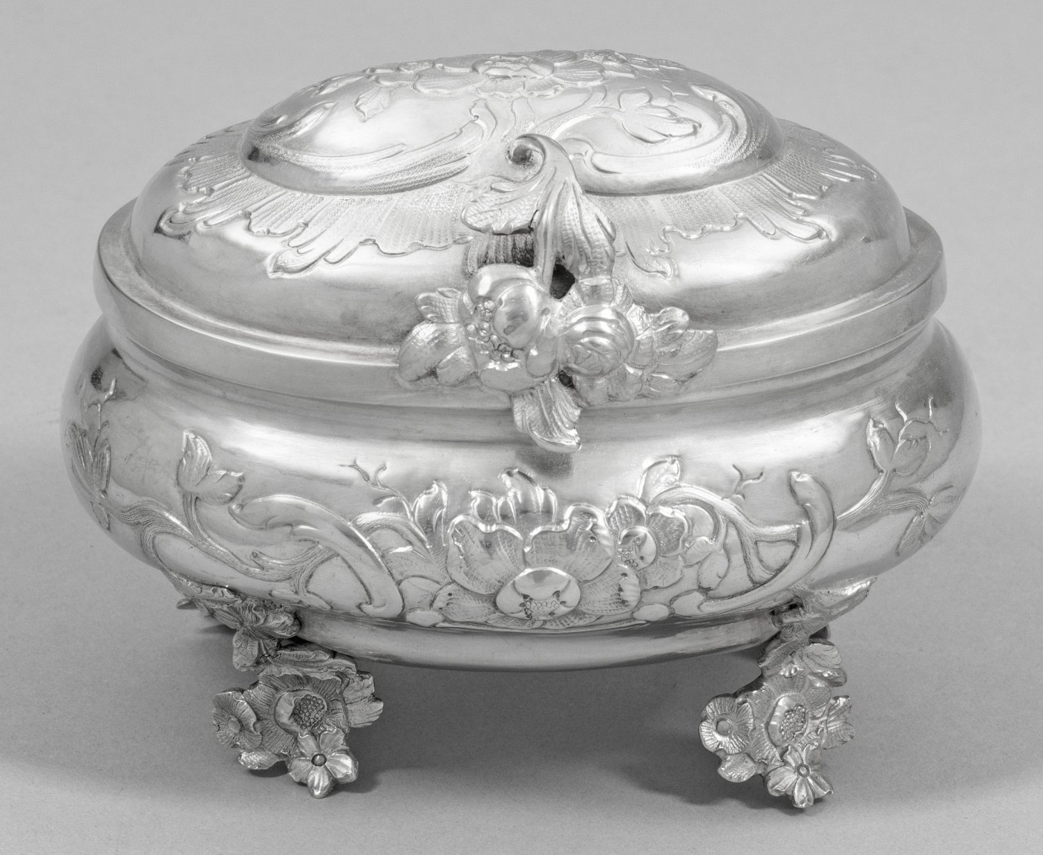 Rokoko-Zuckerdose Silber. Von naturalistisch gearbeiteten rankenden Blütenfüßen getragener gedrückt bauchiger und ovaler Korpus mit aufgewölbt korrespondierendem Scharnierdeckel. Die glatte Wandung umlaufend mit getriebenen Blattranken und Blüten verziert. Auf dem Deckel reliefplastischer Blütendekor umgeben von einem Rocaillenkranz. Ein aus dem Deckel herauswachsender reliefplastisch gestalteter Blütenzweig mit Blättern und üppigen Blüten als Daumenrast. Innen vergoldet. Meister Heinrich Conrad Kretzer (erwähnt ab Mitte 18. Jh.). Gew. ca. 270 g. H. 10 5 cm. 13 5 cm x 10 5 cm.