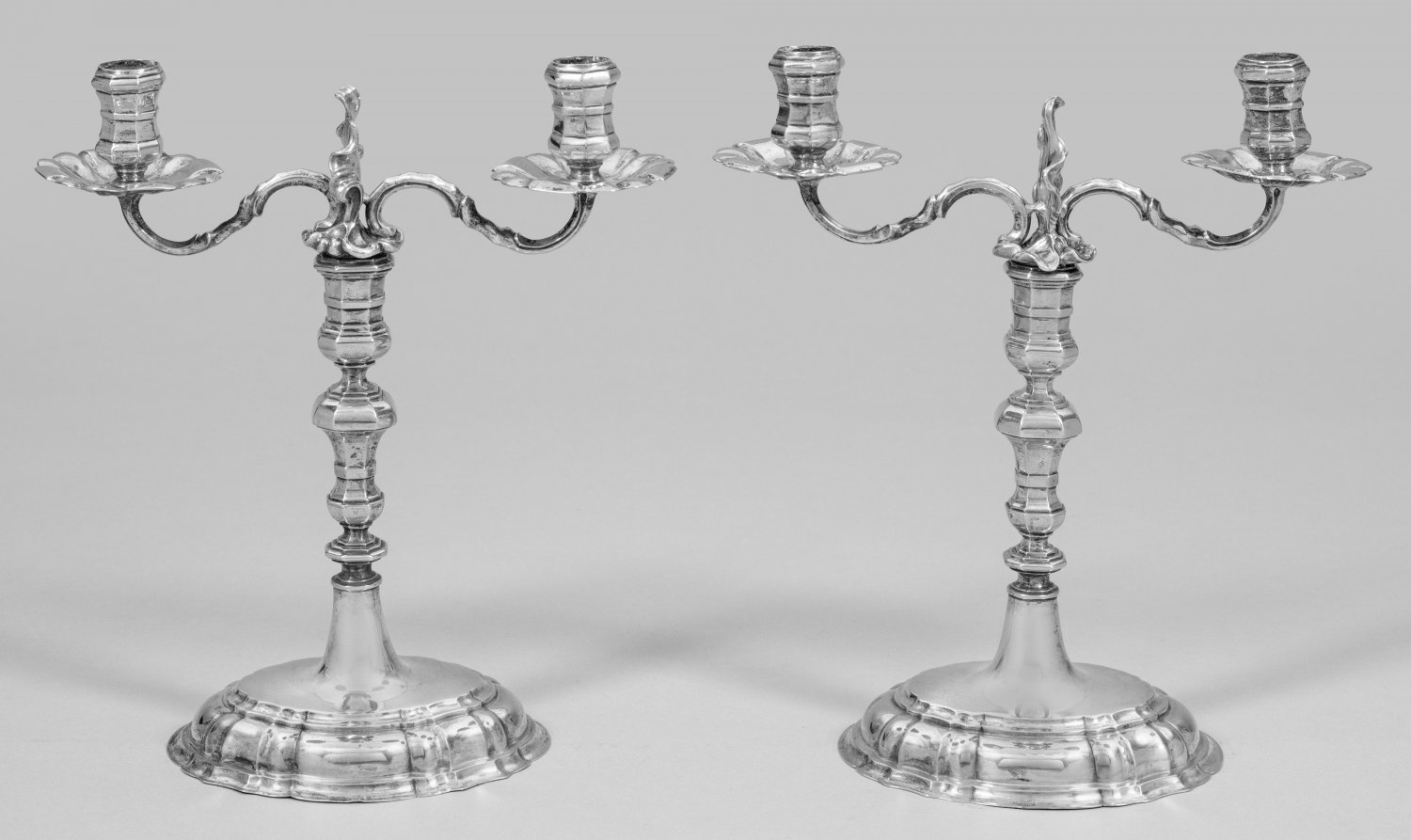 Paar Breslauer Barock-Girandolen Silber. 2-flg.; Ovaler, mehrfach getreppter und aufgewölbter Stand mit geraden Zügen, übergehend in einen achtfach gekanteten und durch mehrere Nodi gegliederten Balusterschaft. Von einer stilisierten Flamme bekrönter Einsatz mit geschweiften Leuchterarmen und kelchartiger, ebenfalls achtfach gekanteter, vasenförmiger Tülle über leicht gewölbter Traufschale. Gest., Tremolierstrich, Stadtmarke, undeutlicher Jahresbuchstabe, Meister George Kahlert d. J. (wird Meister 1732). Gew. ca. 1375 g. H. 28 cm.