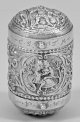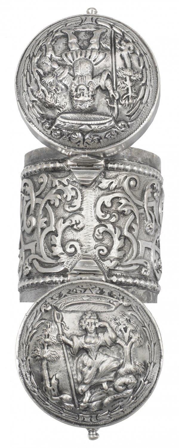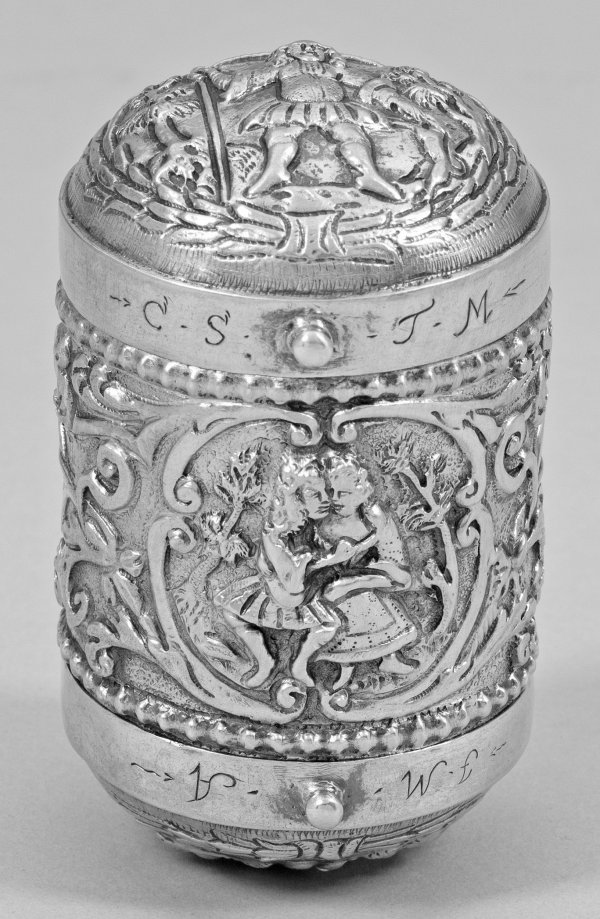 Seltene Talerdose Silber, getrieben. Zylindrisch, als Seitenabschlüsse gewölbte, scharnierte Deckel. Die Wandung mit der Darstellung eines eng umschlungenen Liebespaares, umgeben von naturalistischen Blatt- und Blütenranken. Auf den Deckeln, umgeben von stilisierten Lorbeerblattkränzen, ein Mann bzw. eine Frau jeweils mit einem Speer bewaffnet unter einer Krone. Innenfach geteilt durch Zwischenboden. An den Deckelrändern monogr.; Gew. ca. 92 g. H. 5,5 cm. 8,7 cm x 5 cm.