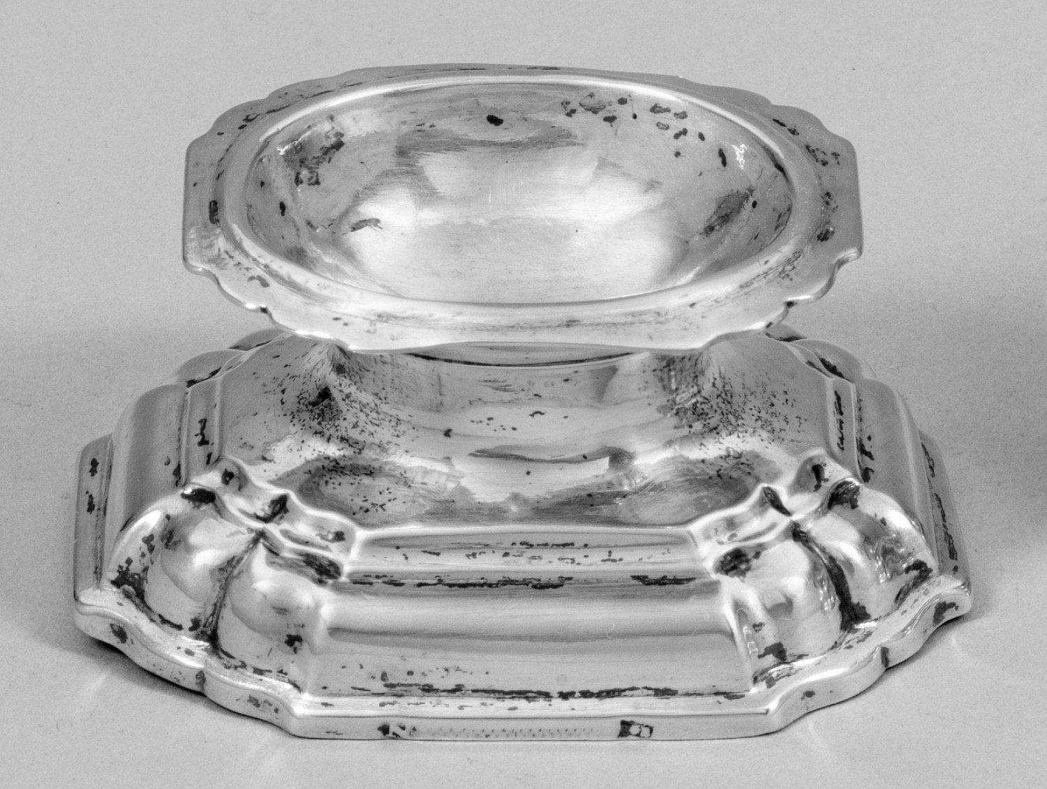 Kleine Barock-Saliere Silber. Länglich oktogonaler, mehrfach getreppter, an den Ecken durch geschweifte Züge gegliederter, aufgewölbter Stand, übergehend in ovale, gemuldete Schale mit gewelltem Rand. Gest., Tremolierstrich, Stadtmarke, undeutl. Meistermarke; Gew. ca. 66 g. H. 4,5 cm. 9,5 cm x 6 cm.