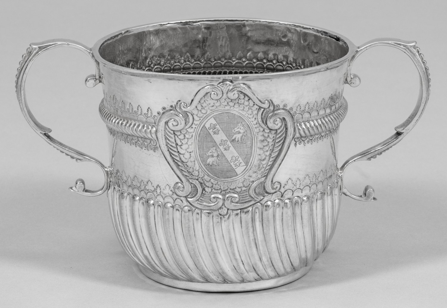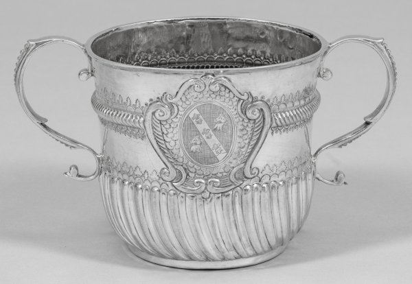 Seltenes George I-Doppel-Henkelgefäß sog. Porringer. Silber. Über flachem Stand leicht konischer Korpus mit seitlichen Volutenhenkeln. Glatte Wandung mit schauseitiger von Voluten gerahmter Kartusche. Darin ein Wappen im Oval über punziertem Schuppendekor. Untere Wandungshälfte reliefplastisch godroniert übergehend in fein ziselierten Blattfries. Auf der oberen Wandungshälfte ein umlaufend getriebener Zungenfries umgeben von punziertem und ziseliertem Blätter- und Wellendekor. Innen vergoldet. Gest. Beschaumarken Jahresbuchstabe Meister William Denny (tätig seit ca. 1697). Gew. ca. 405 . H. 12 cm.