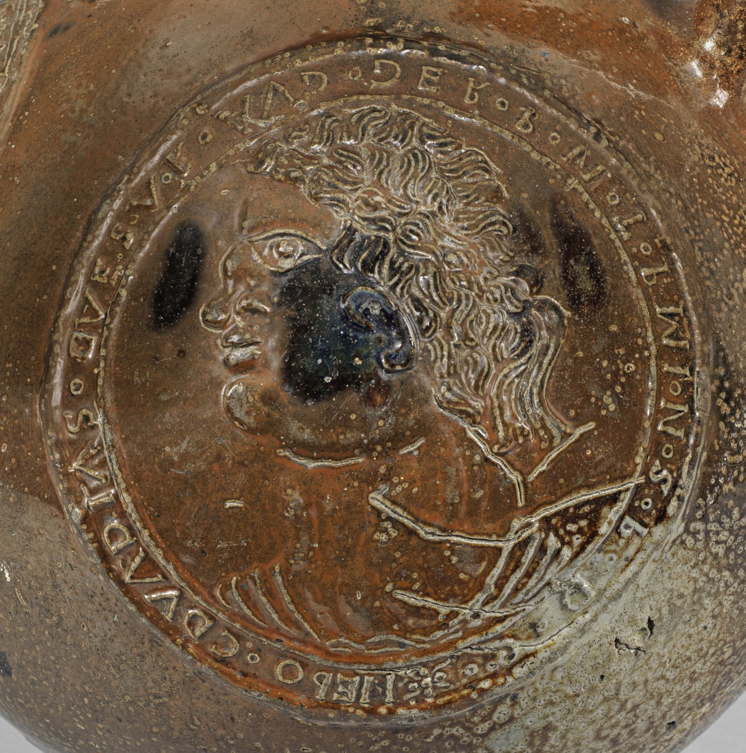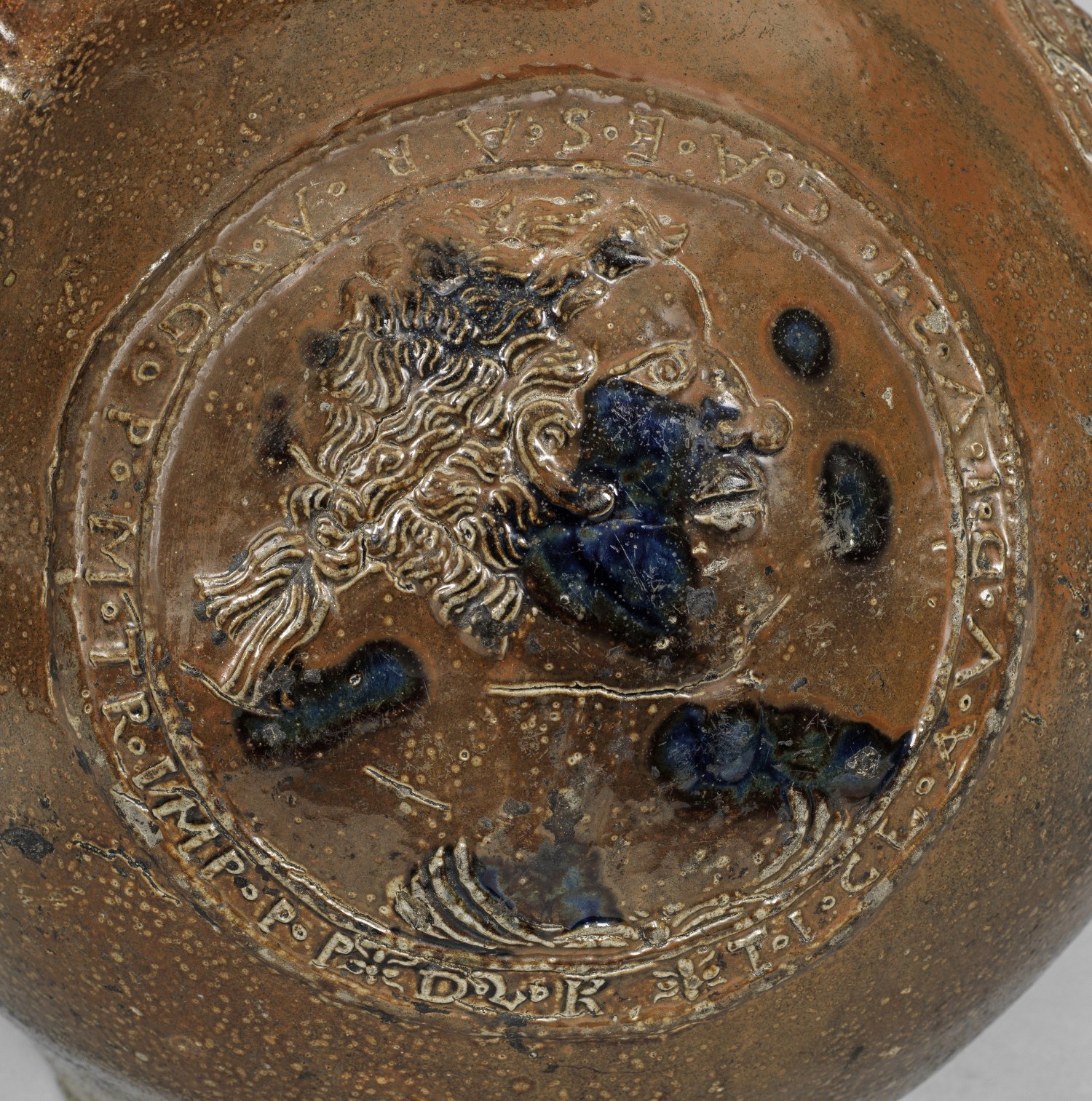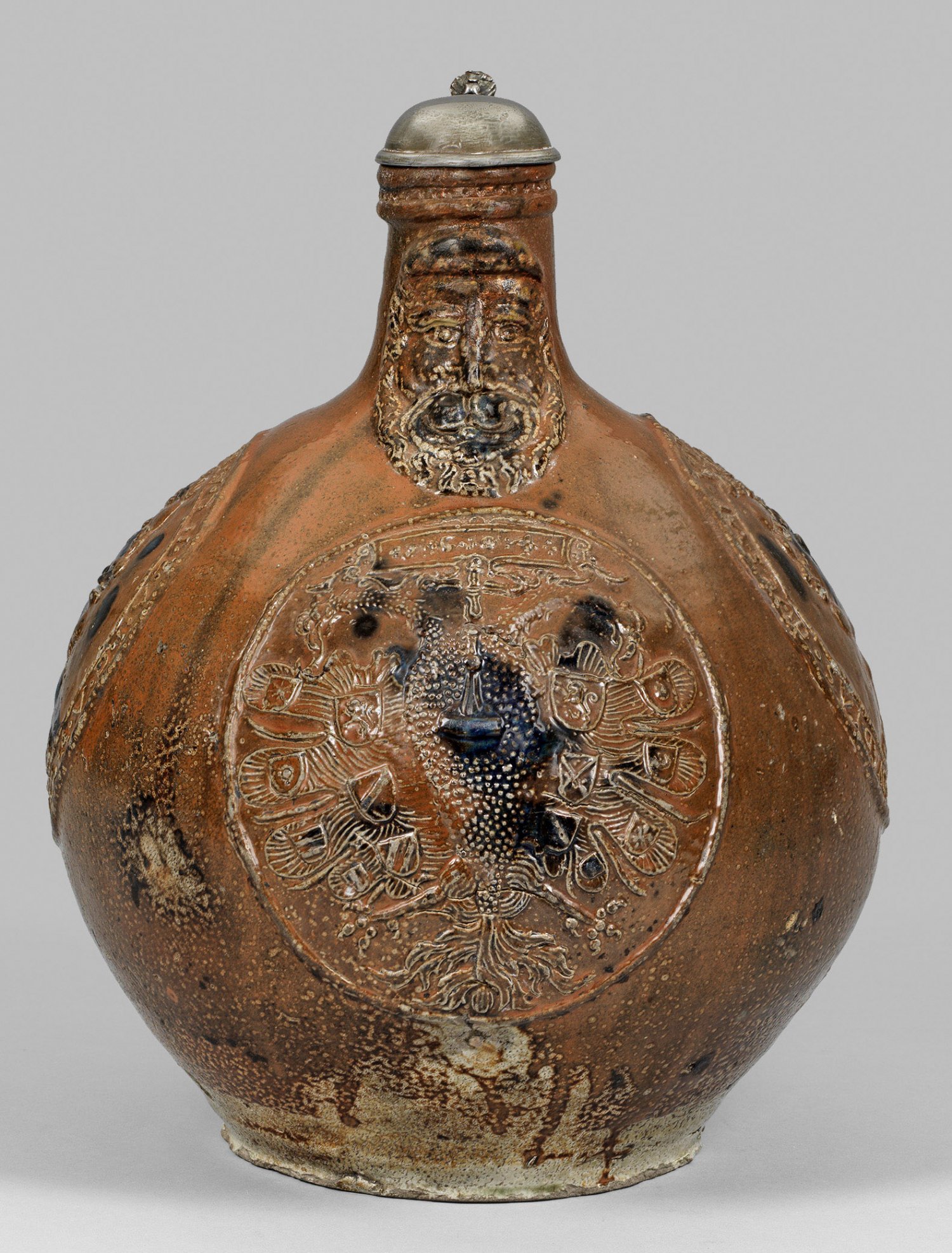 Braunes, salzglasiertes Steinzeug mit Tupfen kobaltblauer Bemalung. Kugelbauch, in kurzen, engen Hals einschwingend; breiter Bandhenkel. Die stilisierte Bartmaske am Hals fröhlich blickend. Schauseitig am Bauch großes Rundmedaillon mit doppelköpfigem Reichsadler des Heiligen Römischen Reiches als Quaternionenadler. Auf den Schwingen die Wappen der bedeutendsten Mitgliedsstaaten als Glieder des Reiches, auf der Brust der Reichsapfel, über den Köpfen ein Schild mit Dat. 1604. Zu den beiden Seiten jeweils ein großes Rundmedaillon nach dem Vorbild antiker Münzen mit Profilbildnissen der römischen Kaiser Claudius und Nero sowie korrespondierenden Umschriften. Rest.; Zinndeckel. H. 36,5 cm.
