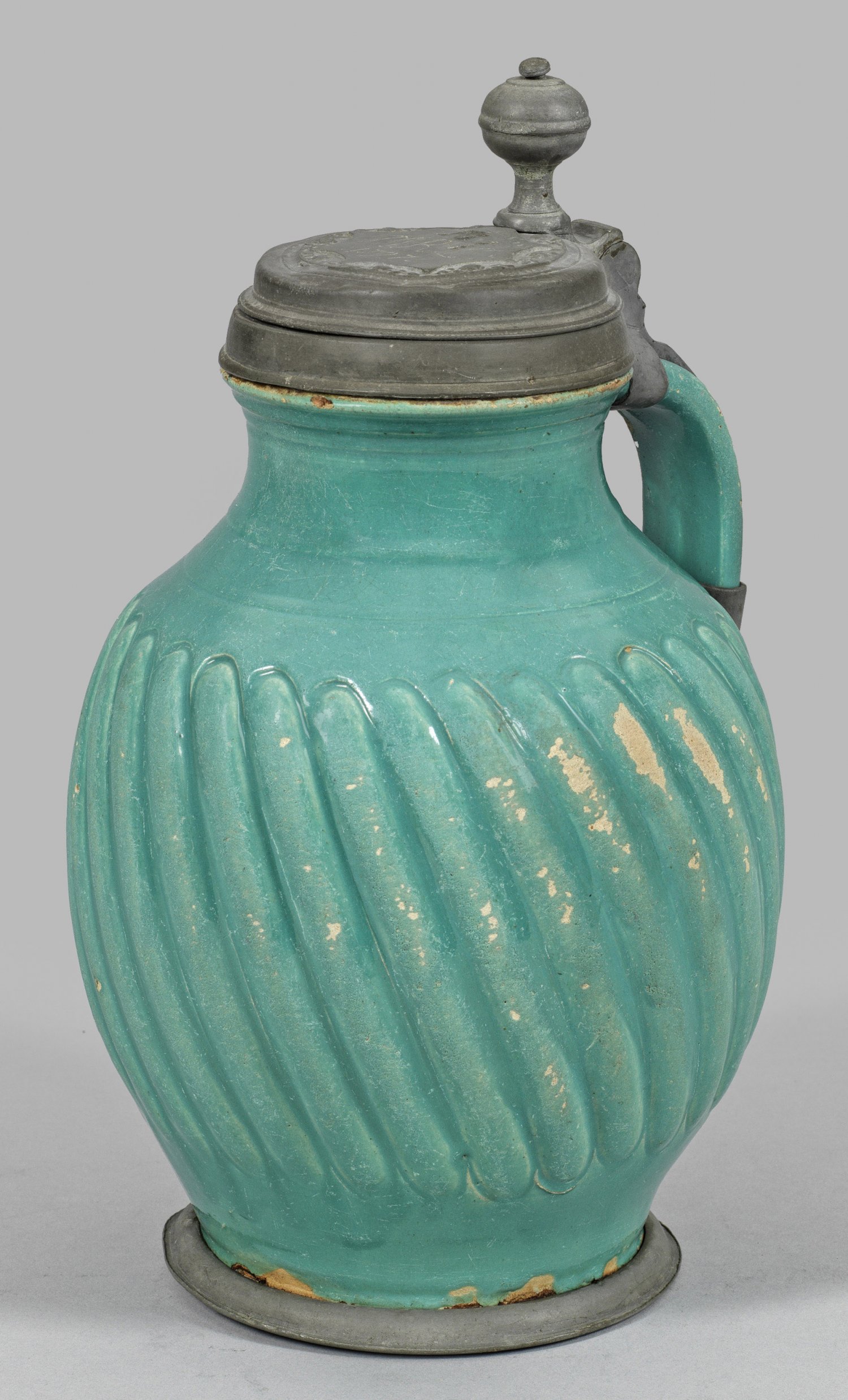 Melonenkrug Hochgebrannte Irdenware, türkisgrün glasiert. Gebauchter, schräg godronierter Korpus. Zinnmontierter Fuß, der Deckel mit Kugeldrücker und graviertem Monogr. u. Dat. 1797. Glasur ber.; H. 27 cm.