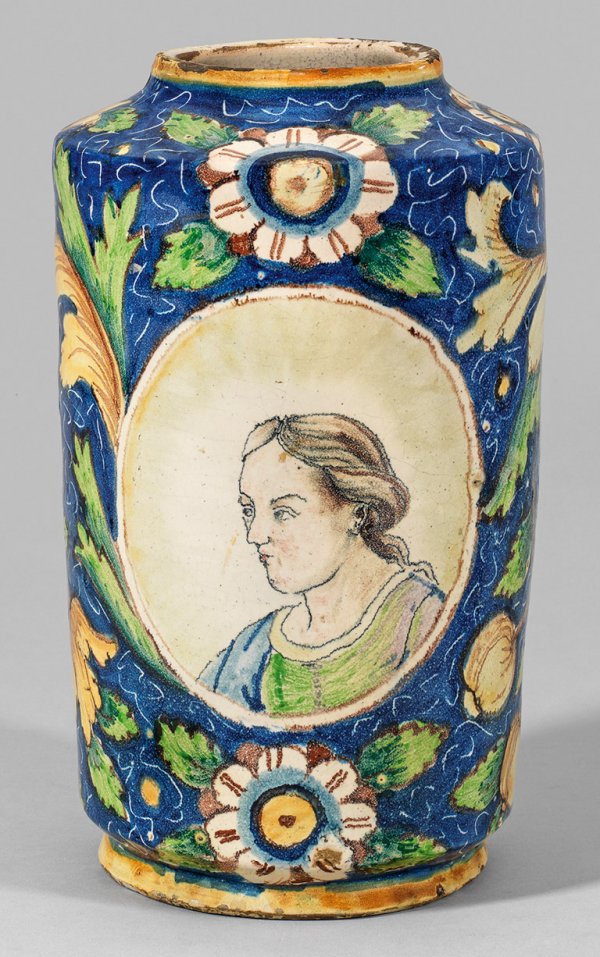 Großer Albarello mit Damen- und Herrenbildnis Majolika. Polychromer Scharffeuerdekor. Auf der Wandung zwei Ovalmedaillons mit Profilbildnissen, der Fond mit Blüten- und Akanthusrankenornament. Best.; H. 34 cm.