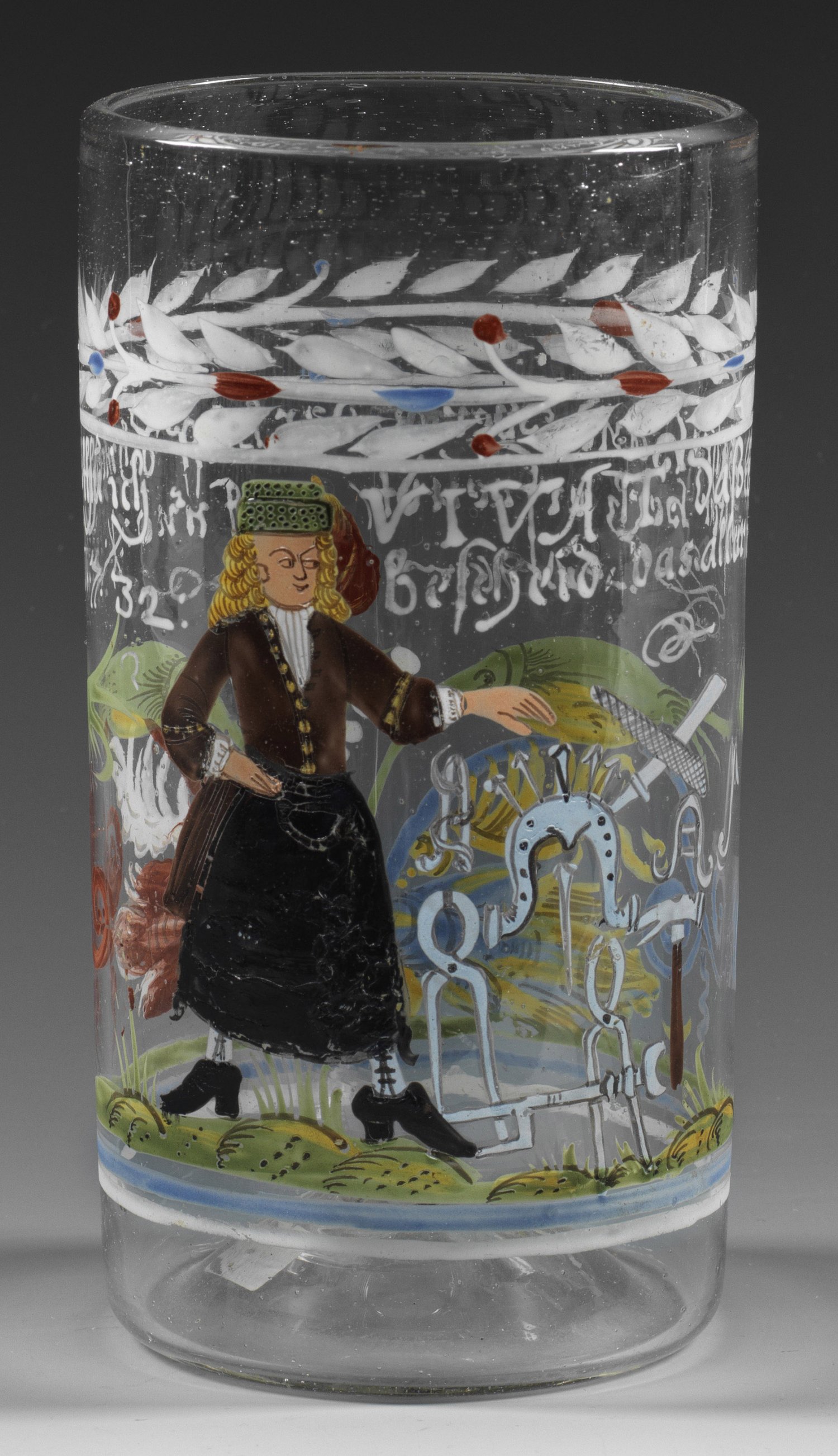 Barock-Becher der Hufschmiede-Zunft Farbloses Glas. Zylindrische Form. Polychrome Emailbemalung. Schauseitig die Figur eines Hufschmiedes mit seinen Werkzeugen und Erzeugnissen rücks. floraler Dekor mit korrespondierendem Spruch auf die Hufschmiede-Zunft und Dat. 1732. H. 17 2 cm.