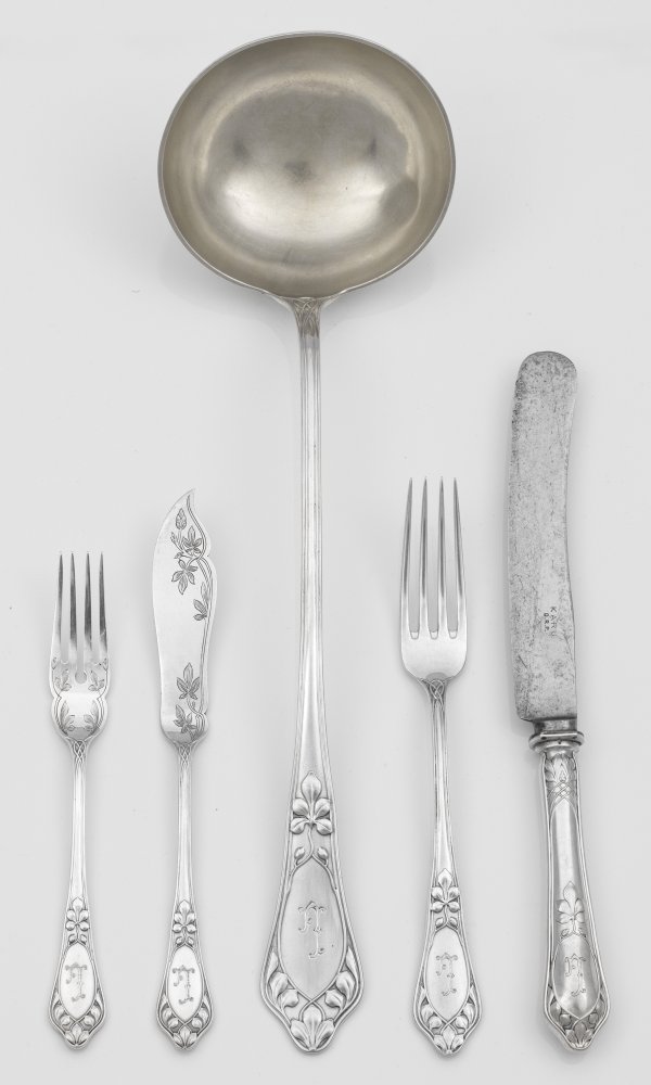 Jugendstil-Restbesteck Silber. 38-tlg.; 12 Fischmesser, 12 -gabeln, 7 Menügabeln, 6 -messer, 1 Suppenkelle. Schmaler Griff mit konischem, flachem Heft. Heftrand bis zum Laffenansatz umzogen von reliefplastischen Blattranken, eine Kartusche mit Monogramm "L" rahmend. Klingen mit graviertem Blattdekor. Teilw. vergoldet. Gest. 800, Herstellerzeichen. Gew. zus. ca. 2360 g (ohne gefüllte Teile ca. 1813 g).