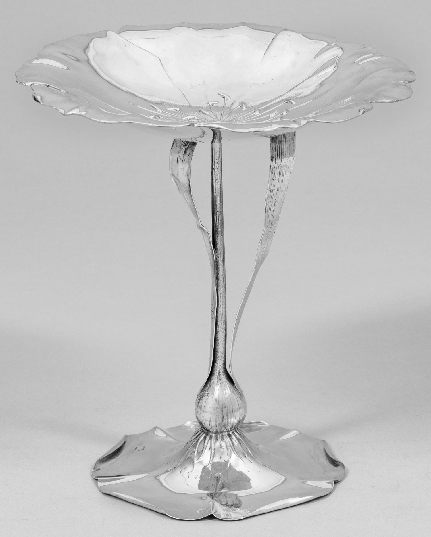 Seltene Jugendstil-Aufsatzschale Silber. Flacher blütenförmig geschweifter leicht ansteigender Stand übergehend in einen Schaft in Form einer vollplastisch gearbeiteten Blumenzwiebel mit Wurzeln. Daraus erwächst ein sich konisch verjüngender Blütenstängel gerahmt von zwei zarten lanzettförmigen Blättern. Darüber eine weit ausschwingende gering gemuldete Schale bestehend aus einer großen Mohnblüte mit fünf Blütenblättern angedeuteter Kapselfrucht und reliefplastisch dargestellten Staubblättern. Gest. 800 Herstellerzeichen Juweliermarke Aron. Gew. ca. 490 g. H. 25 5 cm. D. 23 cm.