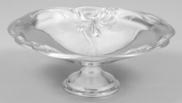 Seltene Jugendstil-Aufsatzschale Silber. Über rundem gewölbtem Stand dreiseitig geschweifte und gemuldete Schale. Glatte Wandung verziert mit teilw. durchbrochen und reliefplastisch gearbeitetem verschlungenem Irisdekor. Entwurf wohl Carl Stock (1876-1945). Gest. 800 Herstellerzeichen. Gew. ca. 459 g. H. 11 5 cm. D. 30 5 cm.