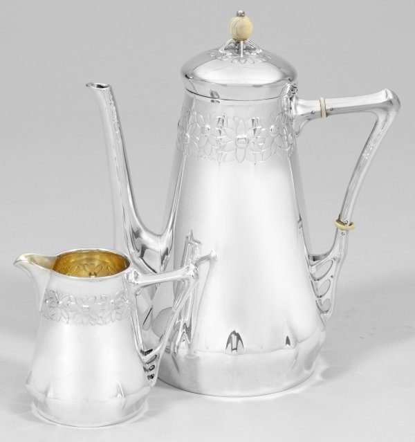 Jugendstil-Kaffeekanne und Cremiere Silber, 2-tlg.; Über rundem Stand hochgezogener, gering bombierter, sich nach oben hin verjüngender Korpus mit tief angesetztem Röhrenausguss und gekantetem, vegetabil gestaltetem Griff. Oberes Wandungsviertel und scharnierter Deckel umlaufend mit Blütendekor in Form von Margeriten-Blüten verziert. Als Knauf eine Kugel aus Bein. Innen vergoldet. Modell-Nr. 174078, 151013. Gest. 800, Herstellerzeichen, Händlermarke Leonhard & Fiegel. Gew. zus. ca. 804 g. H. 10 cm - 25 cm.