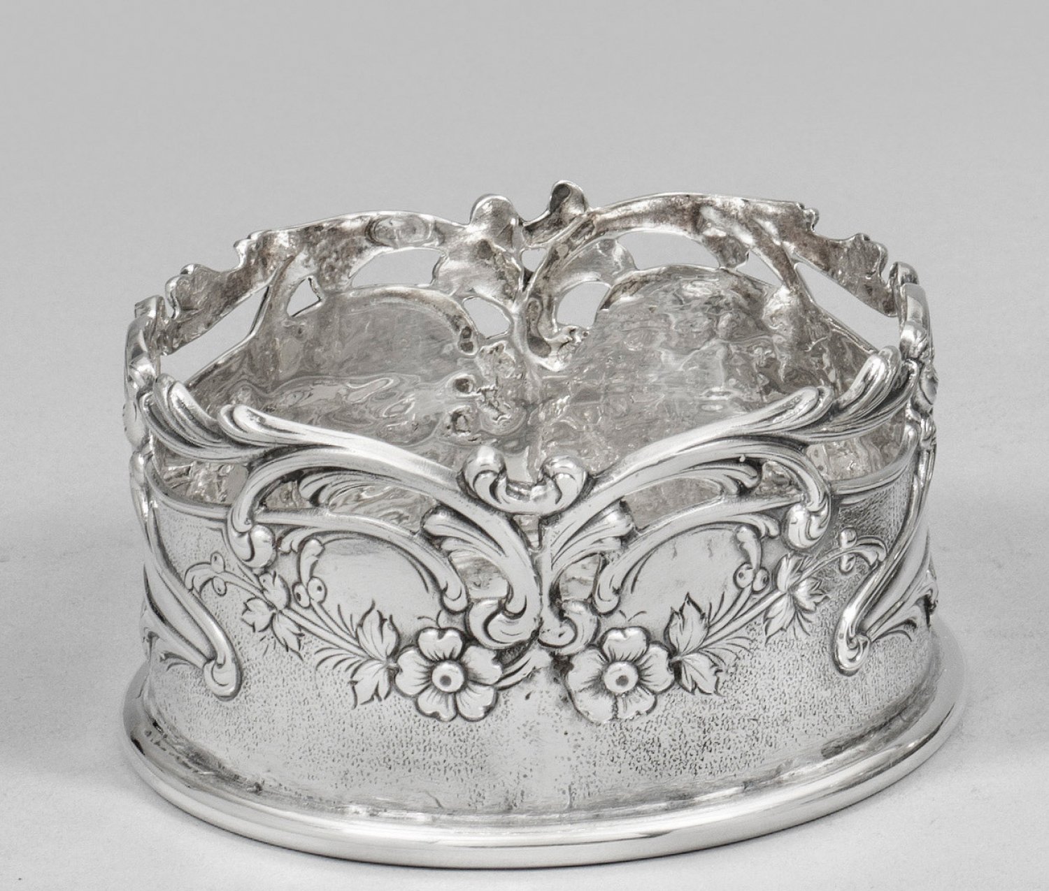 Flaschenuntersetzer Silber. Zylindrische durchbrochen gearbeitete Wandung umzogen von reliefplastischen Blattranken und Blüten. Gest. 800. Gew. ca. 185 g. D. 9 cm.