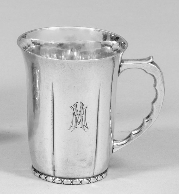 Kleiner Henkelbecher Silber. Über kurzem Stand mit Ornamentband konischer, mit vertikalen Zügen gegliederter Korpus. Seitlicher Henkel. Monogr. "MM" und dat. 23.4.1930. Minim. best.; Gest. 925, Herstellerzeichen, Händlermarke Gebr. Friedländer. Gew. ca. 82 g. H. 7,8 cm.