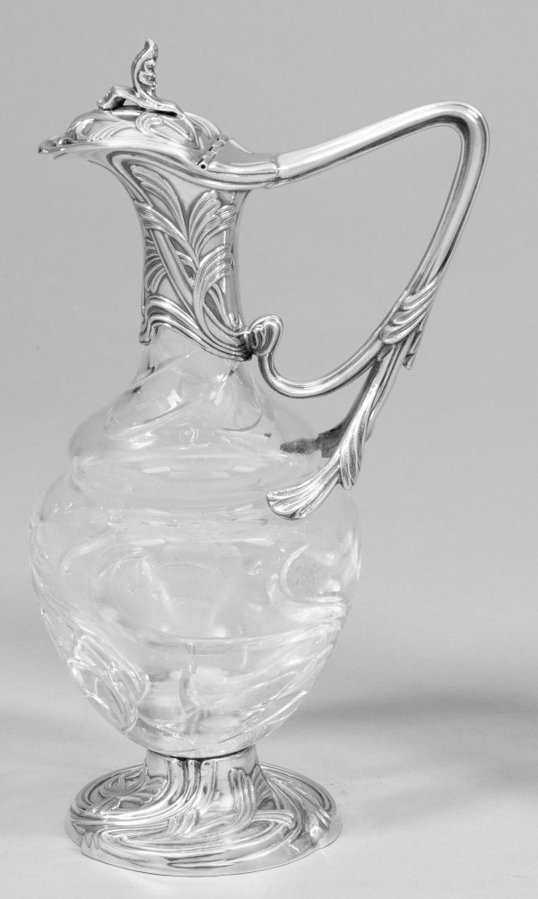 Karaffe mit Silbermontierung. Kugeliger volutenförmig geschnittener Korpus aus farblosem Kristallglas. Auf glatter Montierung und flachem Deckel reliefplastischer stilisierter Blattdekor in Jugendstilmanier. Gest. 925. H. 29 5 cm.