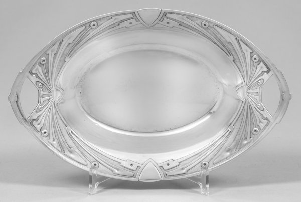 Jugendstil-Brotkorb Silber. Über flachem Ovalstand schiffchenförmiger Korpus mit durchbrochenen Handhaben. Ausgestellter Rand umzogen von strahlenförmig angeordneten abstrakt geometrischen Formen über punziertem Grund. Gest. 800 Herstellerzeichen. Gew. ca. 279 g. 31 7 cm x 20 cm.
