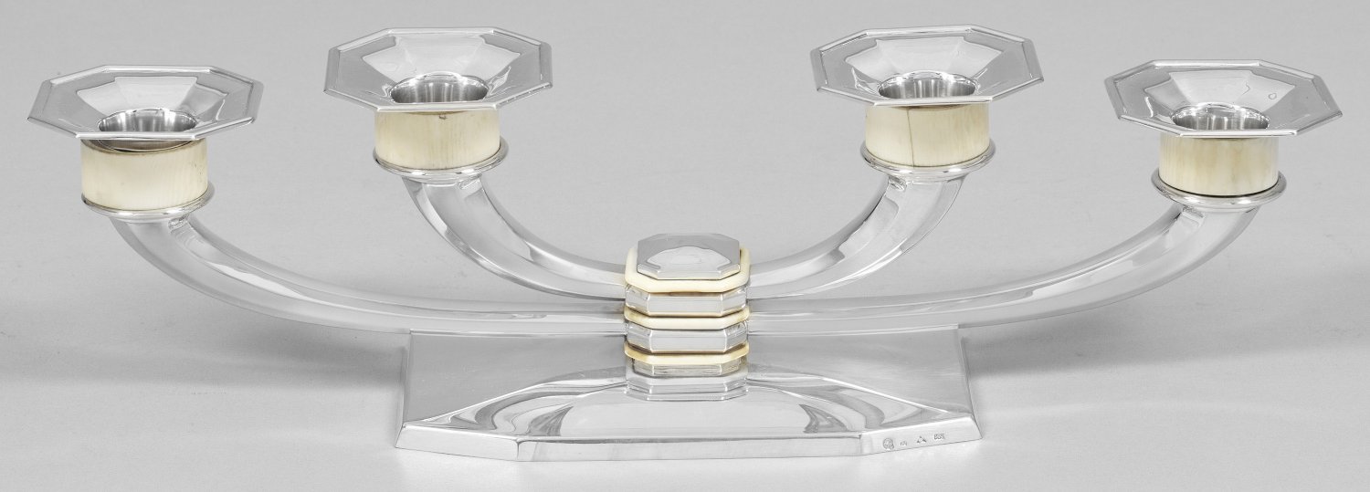 Bedeutender Art Déco-Tischleuchter "Gioconda" Silber und Knochen. Auf einem nahezu rechteckigen Stand ein quadratischer, kurzer Schaft mit seitlich je zwei ausschwingenden, facettierten Leuchterarmen. Zylindrische Tüllen, umgeben von Ringen aus Bein, übergehend in kantig ausschwingende, herausnehmbare Traufschalen. Gest. 835, Herstellerzeichen, "EB". Gew. ca. 562 g. H. 10,3 cm. L. 36 cm..