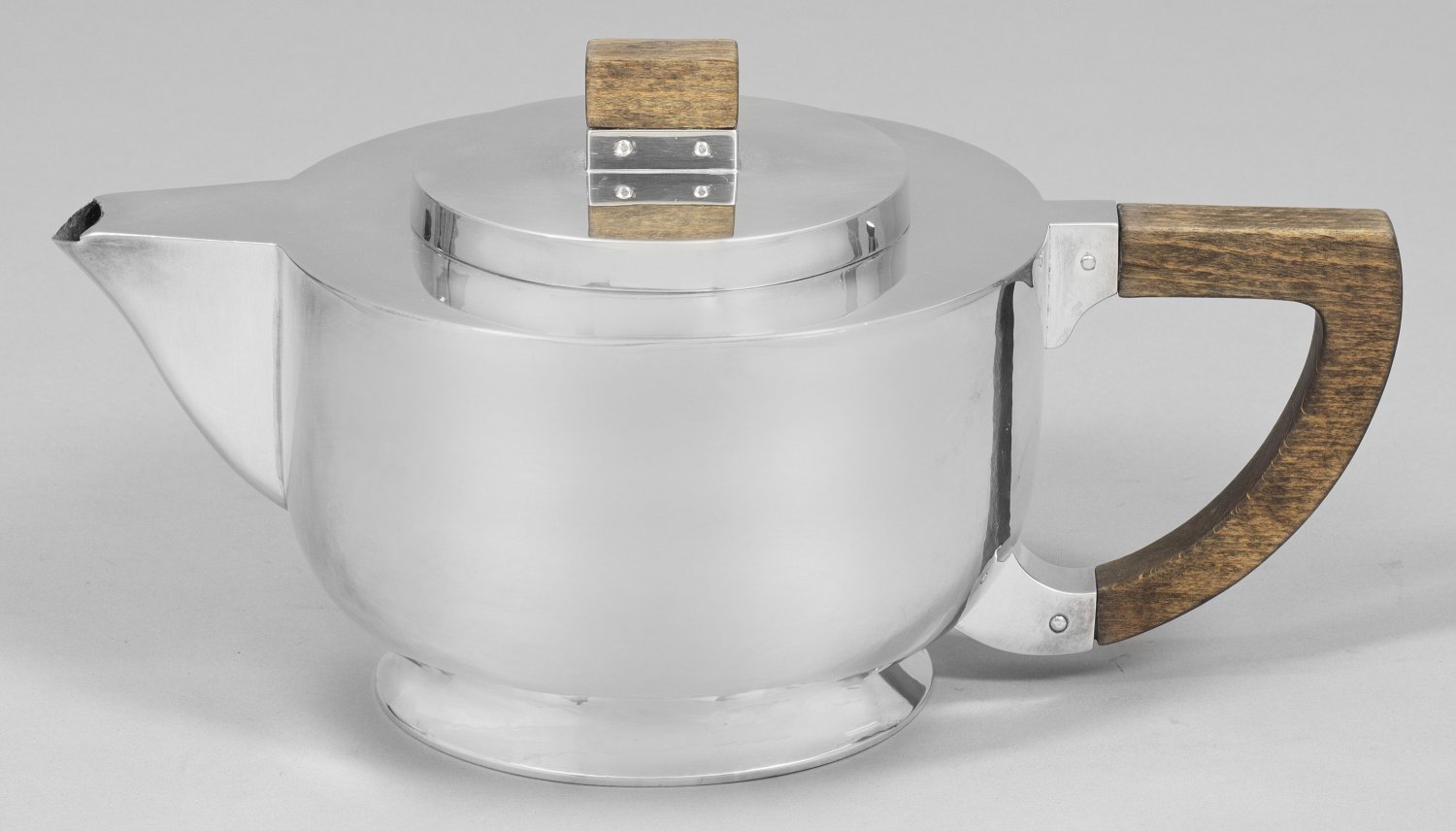 Art Déco-Teekanne Silber und Holz gebeizt. Über kurzem gekehltem Stand runder sich bauchig erweiternder Korpus mit abgesetzter und glatter Schulter übergehend in tief angesetzten Konsolausguss. Runder flacher Deckel mit seitlichem Scharnier und genietetem rechteckigem Holzkorpus als Knauf. Auf der Wandung umlaufend feiner flächendeckender Hammerschlagdekor. Kantiger nach unten ausschwingender Holzgriff. Gest. 935. Gew. ca. 728. H. ca. 14 cm.