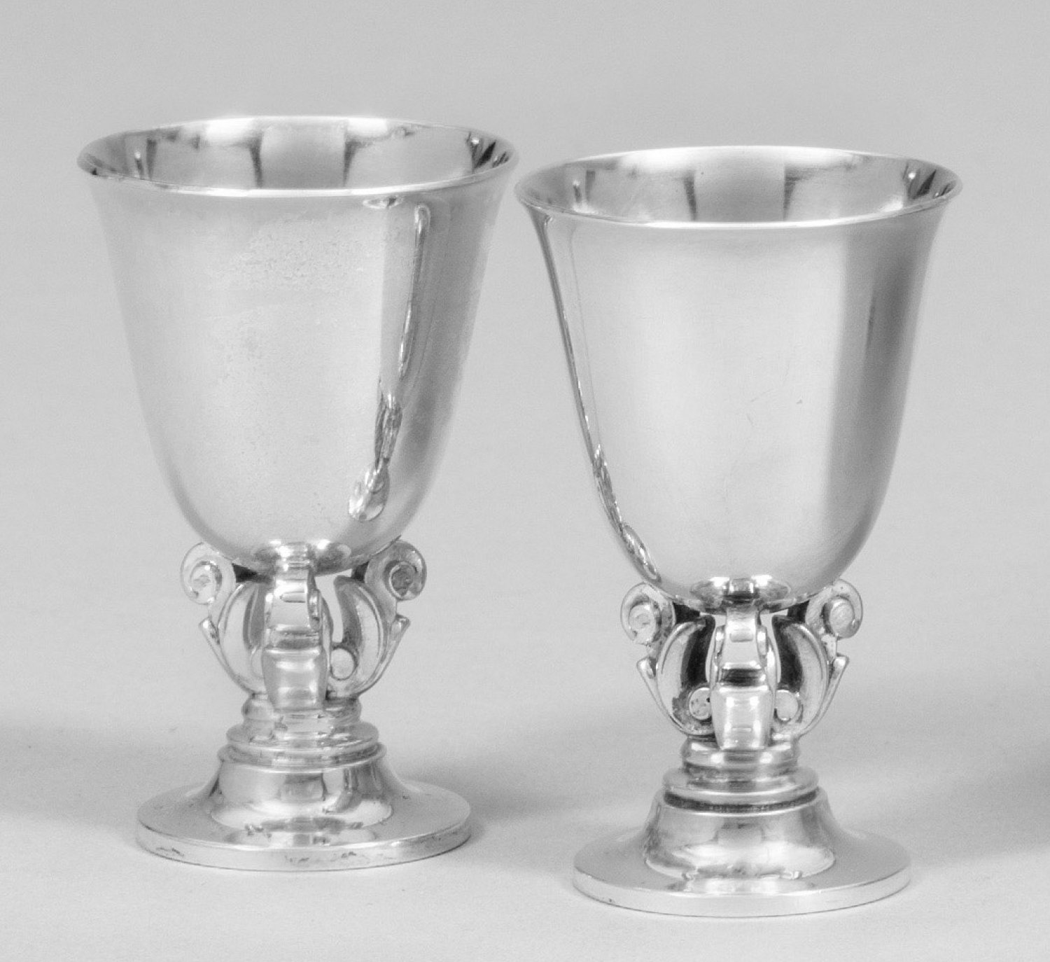 Paar Schnapsbecher "Acorn" Silber. Von drei stilisierten Blättern getragener, glockenförmiger Korpus. Modell-Nr. 741. Modell "Acorn". Entw. Johan Rohde, 1915. Gest. 925, Sterling, Künstlersignet, Herstellerzeichen. Gew. zus. ca. 90 g. H. 6,2 cm.
