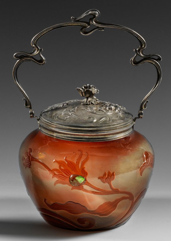 A silver-mounted French Art Nouveau cameo glass biscuit jar by Émile Gallé with acid-etched, wheel-carved and polished decor of blossoms and cabochons on metal foil. Signed "Gallé". Standard mark (950) and manufacturer's mark.