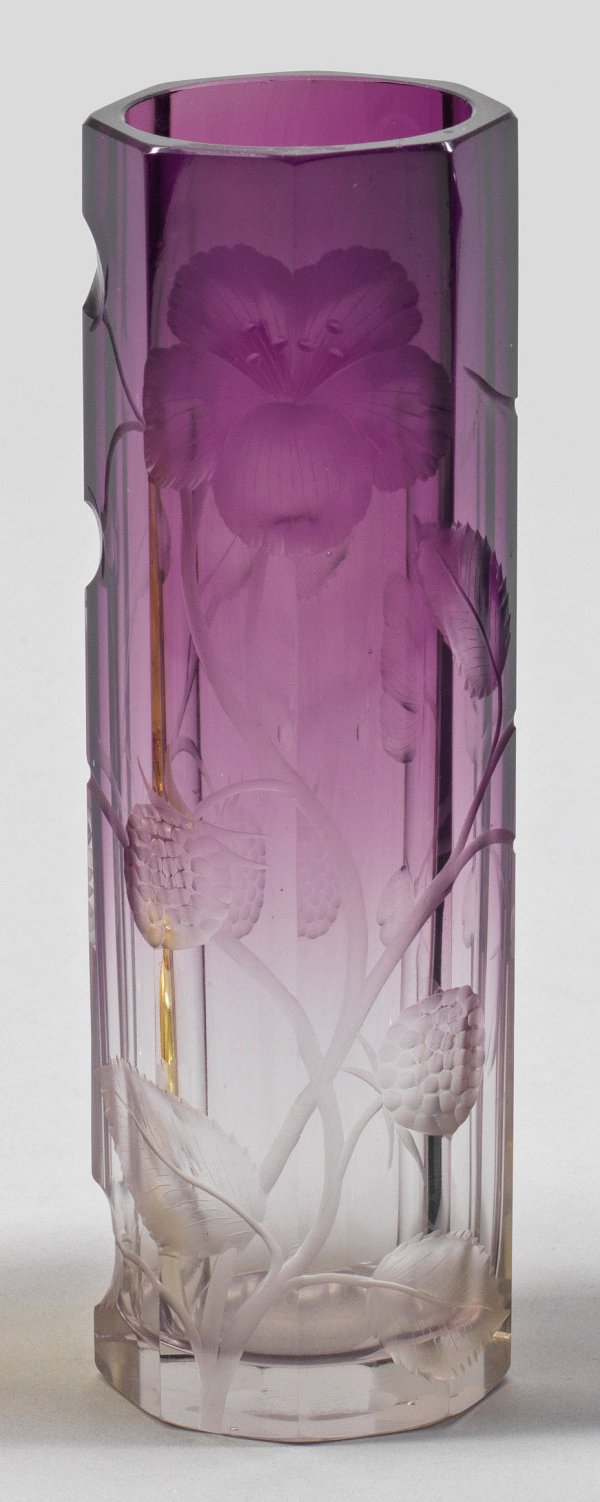 Jugendstil-Stangenvase von Moser mit Erdbeerdekor Schlanke achteckige Form. Farbloses oberhalb violett-amethystfarben verlaufendes Glas geschliffen. Dekor in Tiefschnitt. Firmenmarke. H. 20 5 cm.