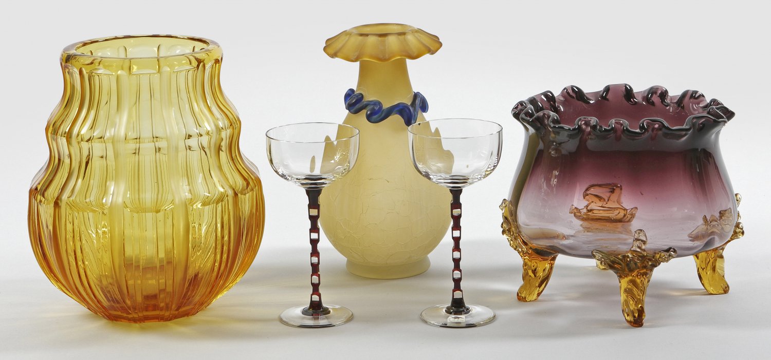 Konvolut von fünf Glasobjekten Verschiedene Formen und Techniken. Bestehend aus einer bernsteingelben Art Déco-Vase, einer Balustervase aus gelblichem Eisglas mit blauem Wellenband, einem Cachepot und zwei Stängelgläsern in der Art von Otto Prutscher. Große Art Déco-Vase ger. best.; H. 19,5 cm-27 cm.