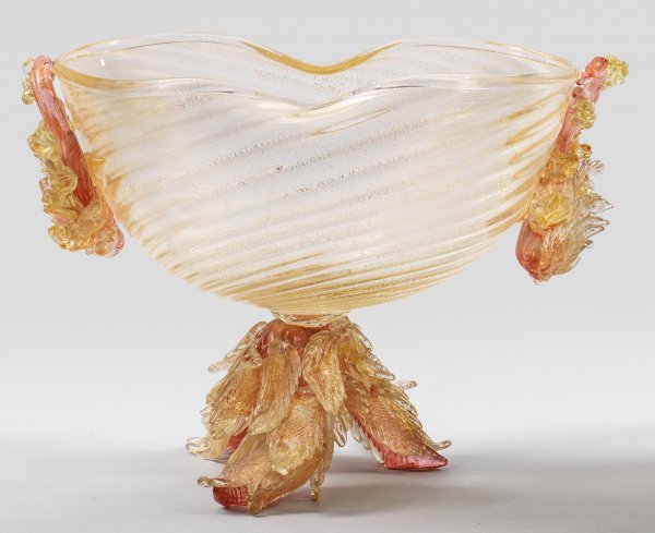 Goßer Murano-Tafelaufsatz Ovale beidseitig am Rand eingezogene schrägoptisch geblasene Schale auf dreifach ausgestelltem aus Blättern gestaltetem Fuß seitlich zwei füllhornartige Handhaben aus plastischen Blüten- Trauben- und Blattapplikationen. Farbloses und rosafarbenes Glas mit Ein- bzw. Aufschmelzungen aus fein zersprengter Goldfolie. H. 28 5 cm.