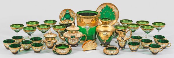 A large splendid 43-piece Murano glass set for 12 people. Green glass with gold and polychrome enamelled decoration. Accompanied by an invoice of the factory.