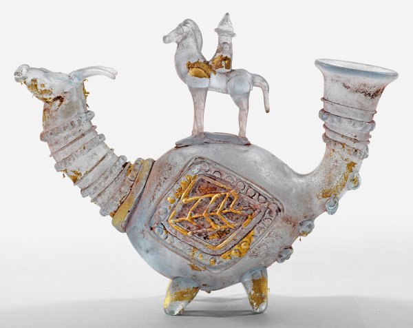 Flaschenartiges Gefäß in Form eines stilisierten Stieres mit füllhornartigem Ausguss und einem als Reiter gestalteten Griff; Inspiration für Nason war ein berühmter, antiker, etruskischer Keramik-Askos aus dem 8. Jh. v. Chr. im Archäologischen Museum in Bologna. Farbloses, teilw. mattes und raues Glas in "Vetro a scavo"-Technik mit Patinierung und Blattgold. Entw. u. Ausführung Ermanno Nason, 1963-1972. Cenedese-Etikett. Minim. herstellungsbedingte Spannungsrisse. H. 29 cm; B. 38 cm.