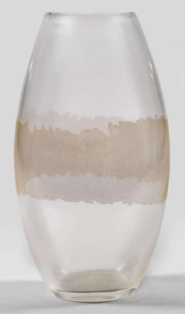 Große moderne Murano-Vase von Vetro Bizazza (Livio Seguso) Gestreckt ovoide in oval gedrückte Form. Farbloses leicht irisierendes Glas am Bauch ein umlaufendes Band mit fein zersprengter Goldfolie. H. 38 cm.