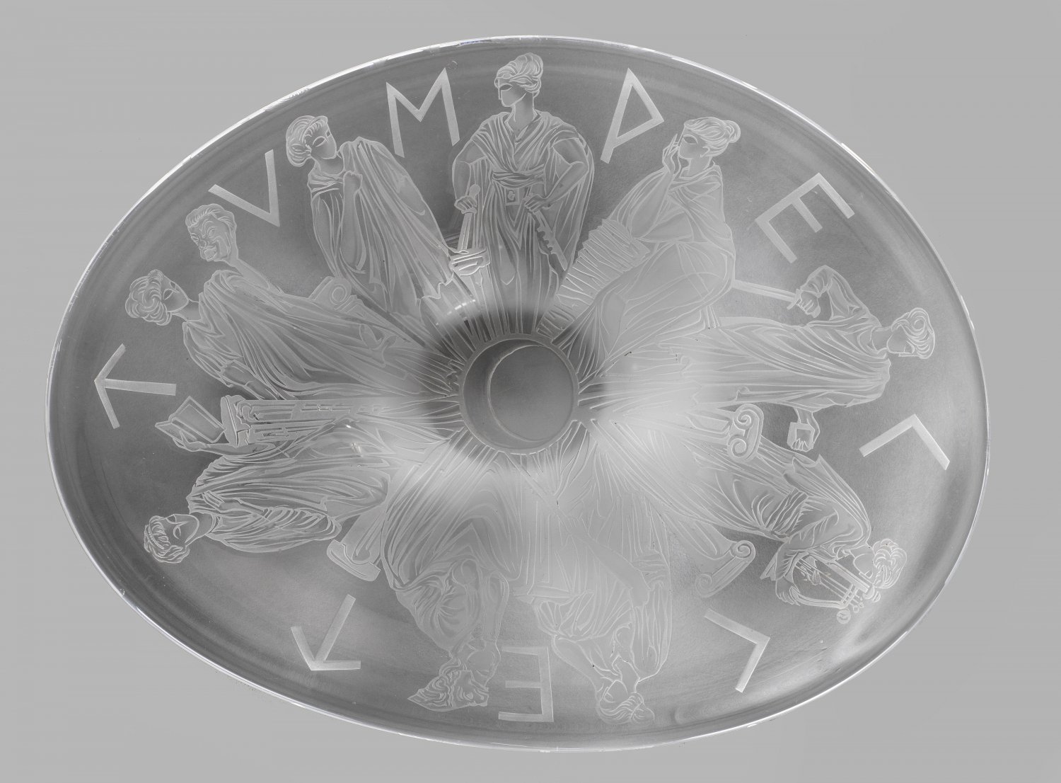 Große moderne Glasschale mit antikisierendem Dekor Oval. Geätzter oder sandgestrahlter figürlicher Dekor mit Darstellung der neun Musen und korrespondierendem Schriftzug. L. 51 cm.