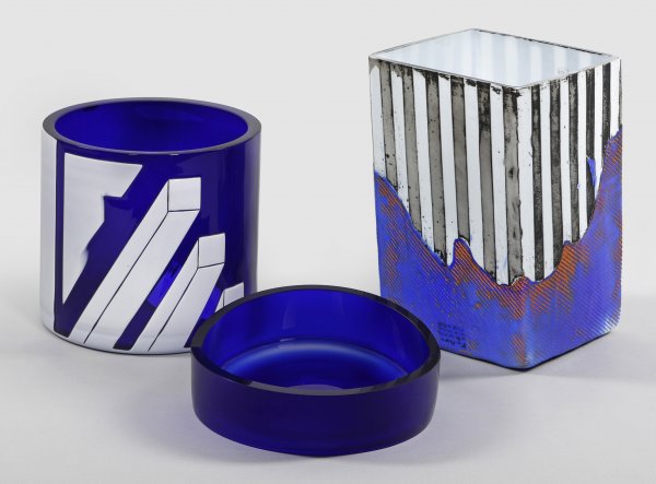 Kollektion von drei zeitgenössischen Studioglas-Objekten Verschiedene Formen und Techniken. Bestehend aus einer ovalen, aus zwei Segmenten zusammengesetzten, dunkelblauen Wipp-Schale von Lada Semecká (auf Etikett bez.), einer dunkelblau-weißen Zylindervase mit geometrischem Dekor von Petr Nemec (auf Etikett bez.) und einer diagonalen Vase mit quadratischem Querschnitt und Gitter- bzw. Flächendekor (undeutl. sign). H. 19,8 cm-28,5 cm; Schale L. 21,8 cm.