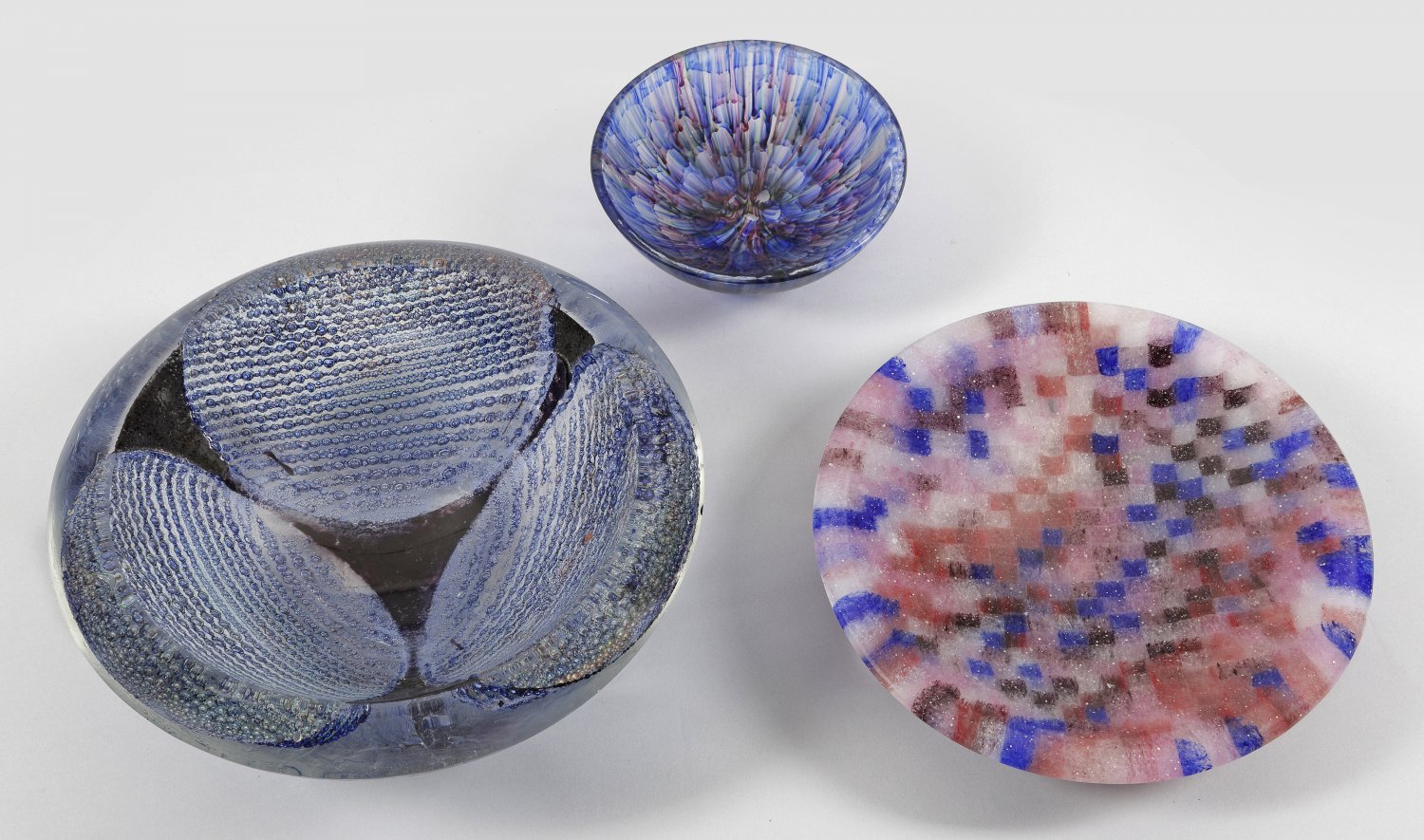 Kollektion von drei Studioglas-Schalen von Josef Welzel Runde Formen verschiedene Techniken. Bestehend aus einer großen dickwandigen Schale mit dreipassigem Sternmuster einer flachen Schale mit Schachbrettmuster und einer kugelig gemuldeten Schale mit Wabendekor. Jeweils monogr. bzw. sign. dat. 1977 und 1991. D. 16 cm- 28 5 cm.
