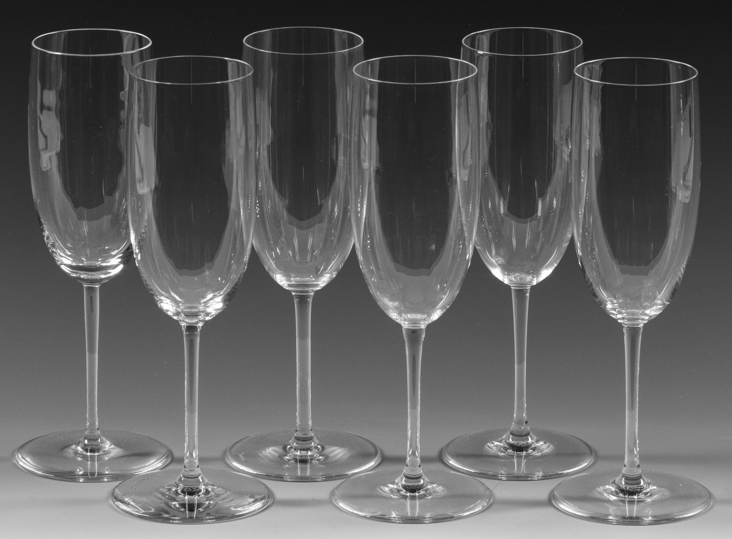A set of six French Baccarat crystal champagne flutes. Acid factory marks.