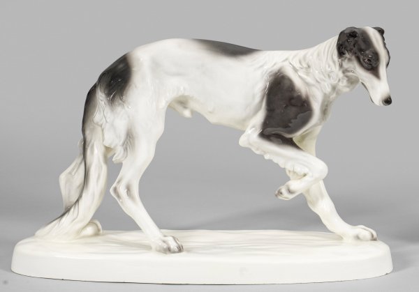 Großer stehender Windhund Steingut. Auf langgestreckter, ovaler Plinthe stehender Windhund mit erhobener, rechter Vorderpfote. Farbige Unterglasurbemalung. Entw. Beaume (Wilhelm Bormann), um 1910/12. Modell-Nr. 6011A. Entw.-Bez.; Minim. best./craquelliert. Manufakturmarke mit Bez. "MADE IN AUSTRIA". H. 32,5 cm. L. 51 cm.