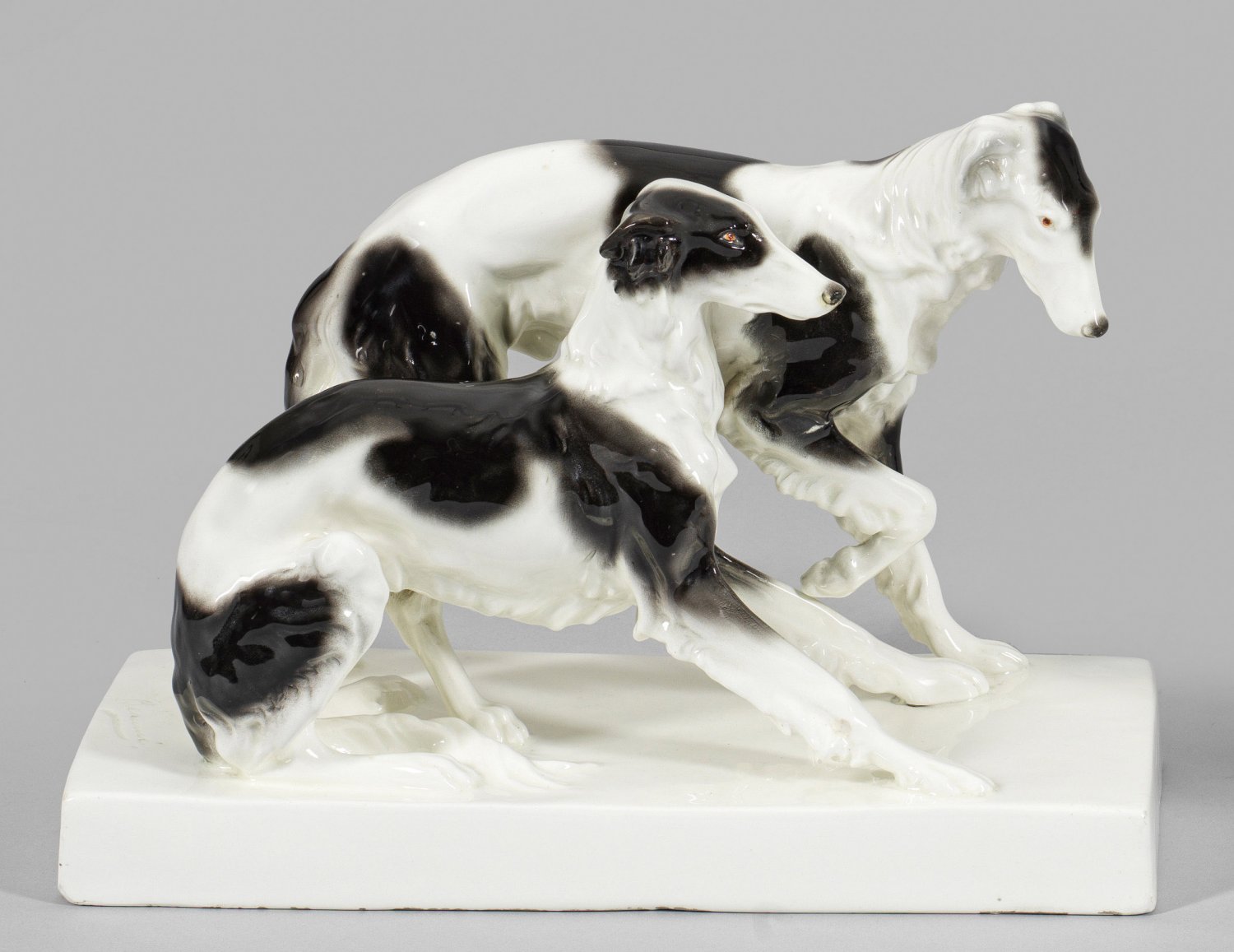 "Zwei stehende Windhunde". Originaltitel Steingut. Auf rechteckiger Plinthe zwei stehende Barsois beim Spiel. Farbige Unterglasurbemalung. Entw. Beaume (Wilhelm Bormann), um 1910/12. Modell-Nr. 3878. Entw.-Bez.; Minim. rest.; Manufakturmarke mit Stempel "F. Goldscheider Vienne". H. 21 cm.