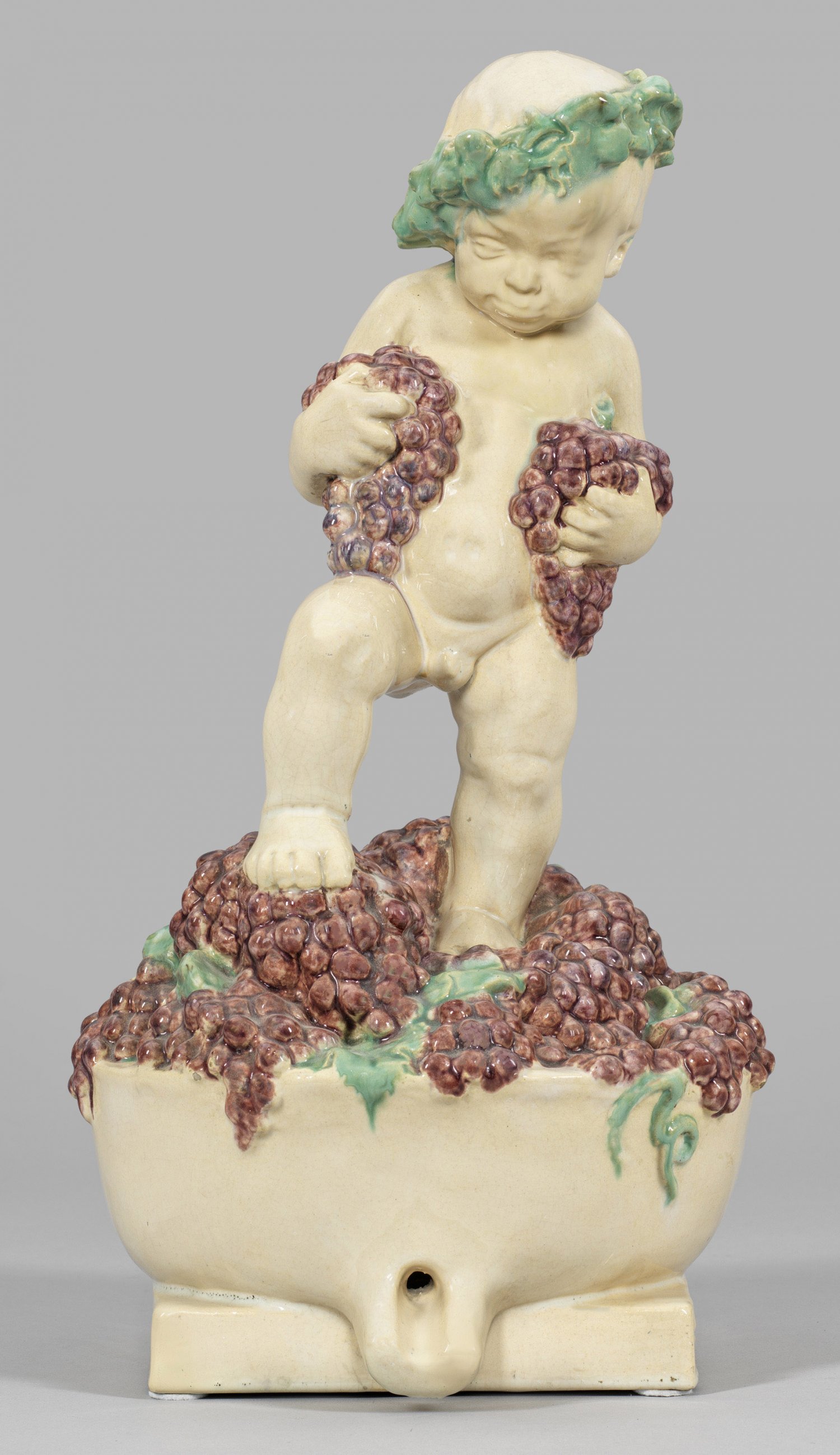 Bacchusknabe mit Weintrauben als kleine Brunnenfigur Irdenware cremefarben glasiert und farbig bemalt. Vollplastischer auf einem runden Bottich mit Trauben stehender Bacchusknabe beim Weinpressen unterhalb eine kleine Auslassöffnung als Speier. H. 46 cm.