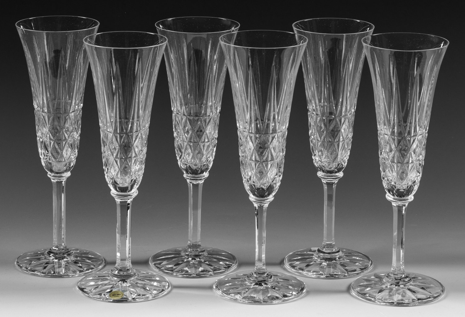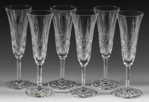 A set of six French Saint-Louis "Tarn" champagne flutes. One glass with factory label.