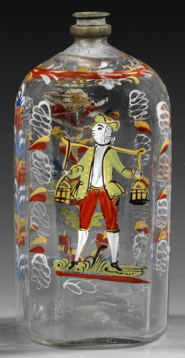 Barock-Branntweinflasche mit Wasserträger Farbloses Glas. Querachteckige Form mit gerundeter Schulter und Zinnverschluss. Polychrome Emailbemalung mit floralem und ornmentalem Dekor schauseitig ein junger Mann beim Tragen eines Joches mit zwei Wassereimern. H. 19 3 cm.