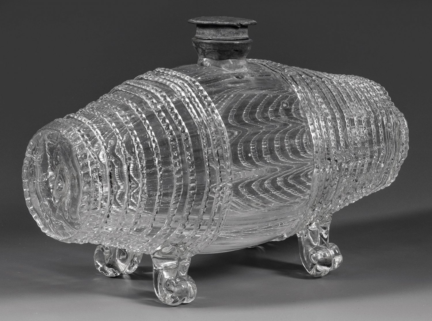 Barock-Branntweinfass Farbloses Glas. Auf vier volutierten Füßen längliches, längsoptisch geblasenes Fass mit feinen, gekniffenen Fadenauflagen, seitlich Abrissspuren. Zinnmontierung mit Schraubverschluss. H. 12 cm; L. 19,5 cm.