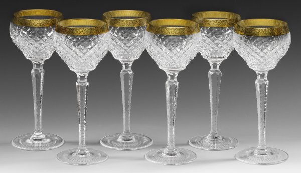 A set of six Bohemian cut crystal wine glasses with gilt rims.